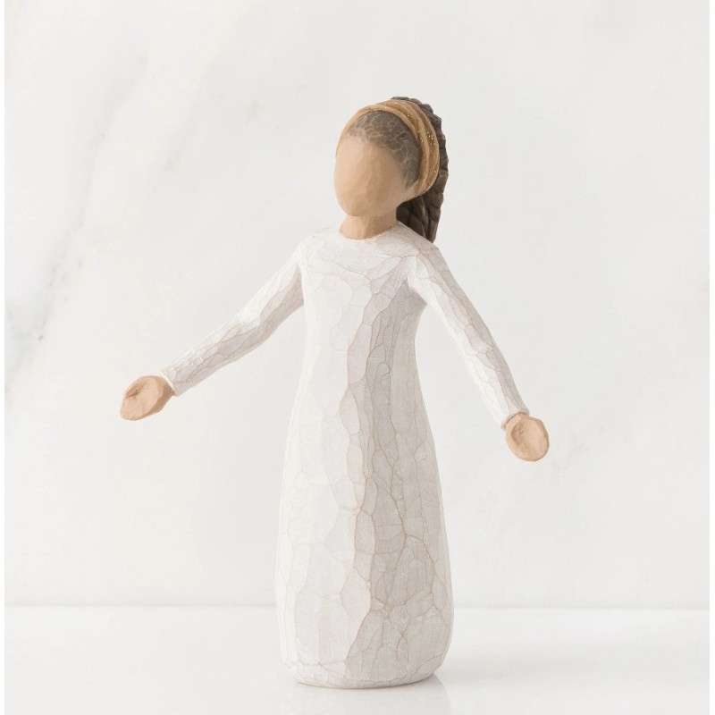 La statue Blessings de Willow Tree, œuvre de Susan Lordi, incarne un message universel de gratitude et de bienveillance. Sculptée à la main en résine et peinte avec soin, elle mesure 14 cm de hauteur. La figure féminine en robe crème, les bras ouverts, exprime l'accueil et la générosité.