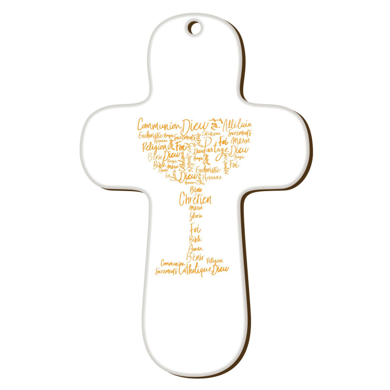 Jolie croix de la collection Sister "au fil des mots" avec un Calice jaune. Le calice est fait de plein de mots empreints de la religion : Bible, Amen, Seigneur, Marie, Lumière, Communion, Foi, Dieu, Catéchisme...