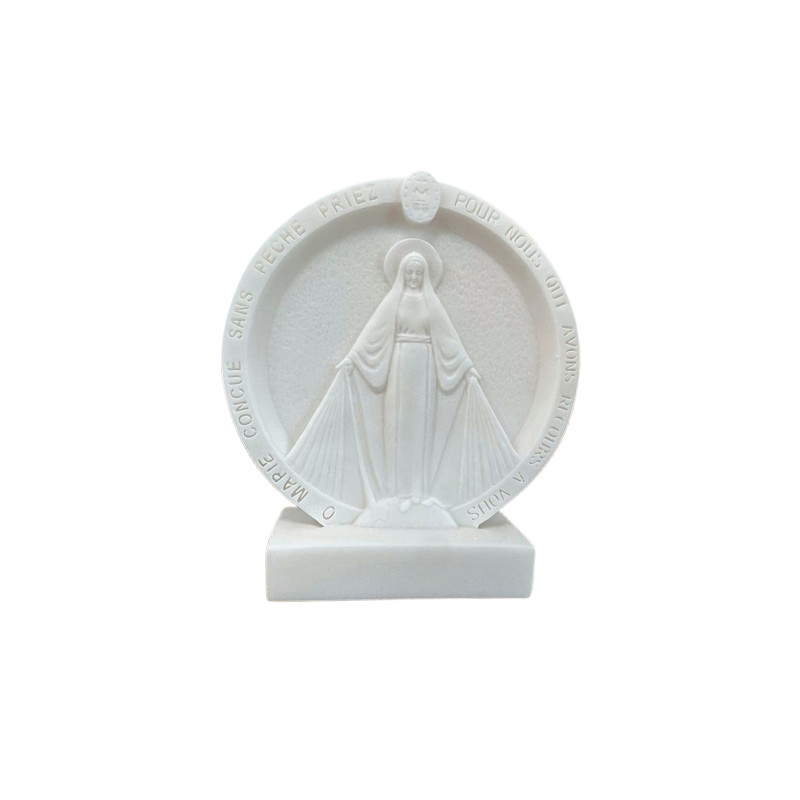 Joli cadre à poser de la Vierge Miraculeuse, en pierre d'albâtre blanche. Très belles finitions.
