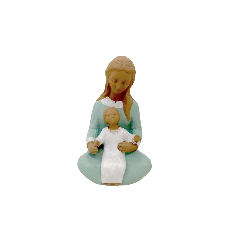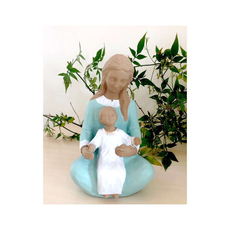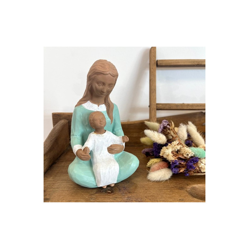 Superbe statue artisanale française. Cette statue en pierre reconstituée, de 15 cm représente Marie assise, tenant Jesus dans des bras. Les finitions sont faites à la main, avec une peinture blanche et verte. Cet article est un cadeau idéal pour un baptême, une communion ou encore un mariage.
