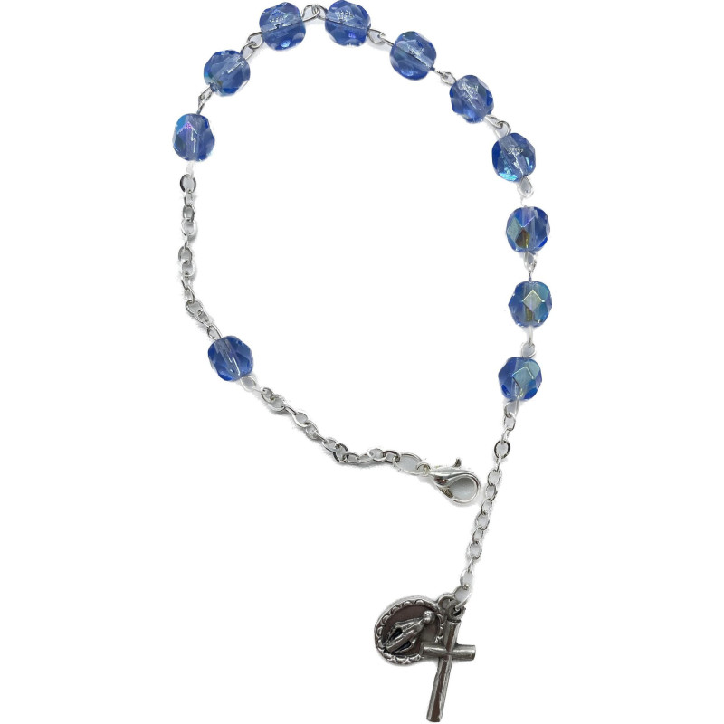 Bracelet dizainier en perle de verre. Couleur Bleu clair. Jolies croix et médailles miraculeuse viennent finir ce bracelet dizainier.