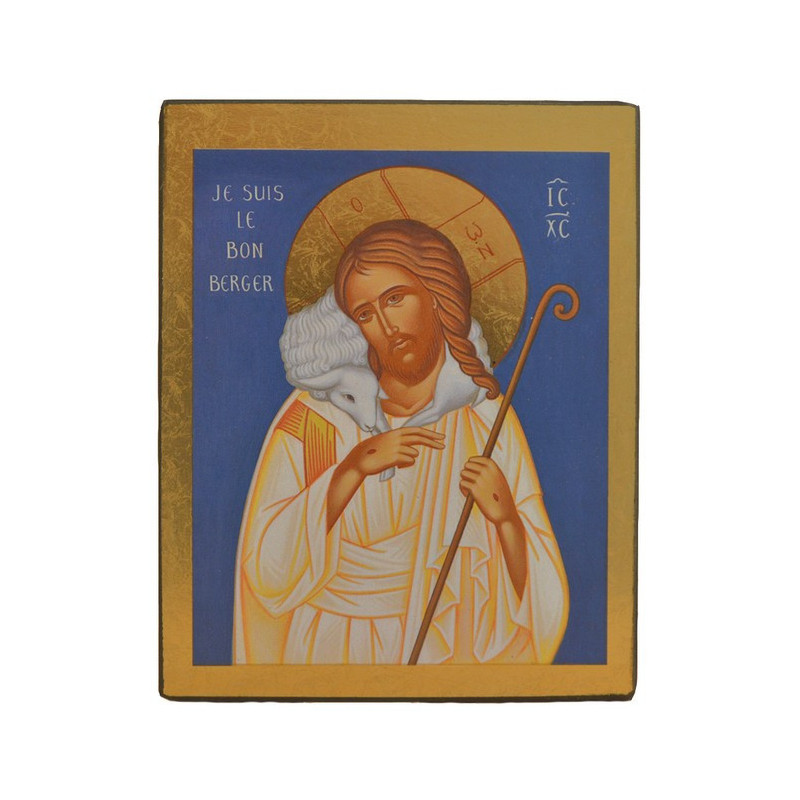 Réalisée en bois, cette icone religieuse représente le bon berger. Cette icone est sur un support en bois massif, doré à la feuille d'or.