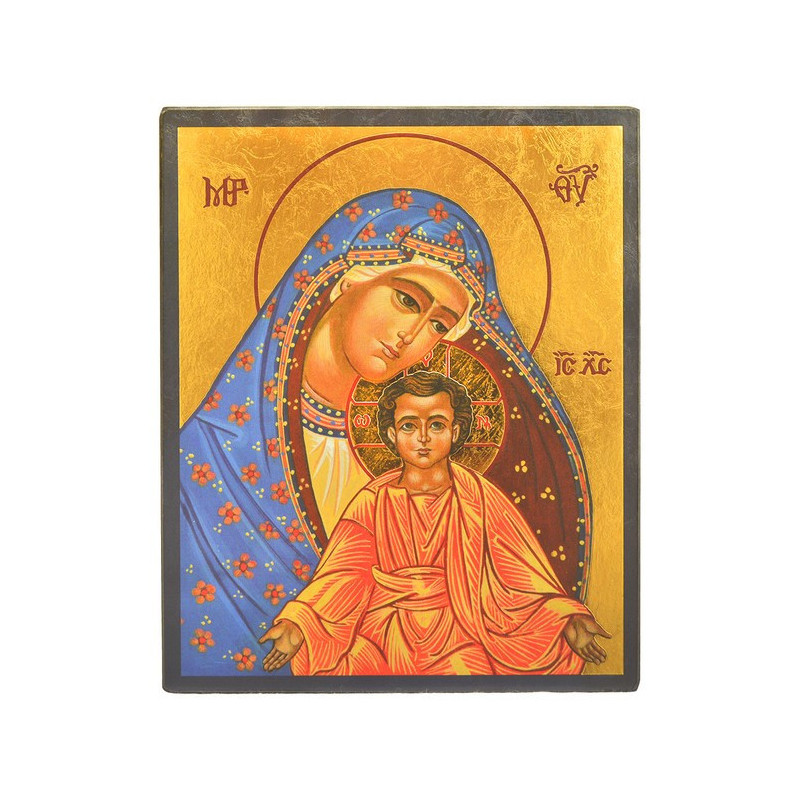 Réalisée en bois, cette icone religieuse représente la Vierge au Manteau. Cette icone est sur un support en bois massif, doré à la feuille d'or.