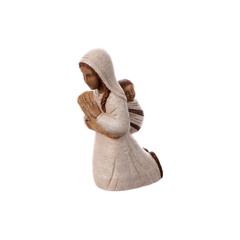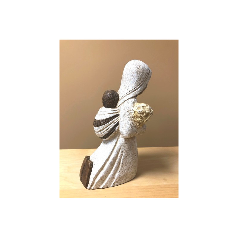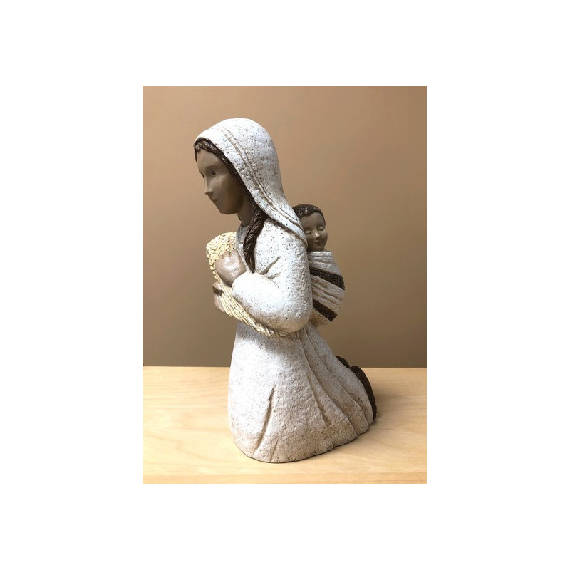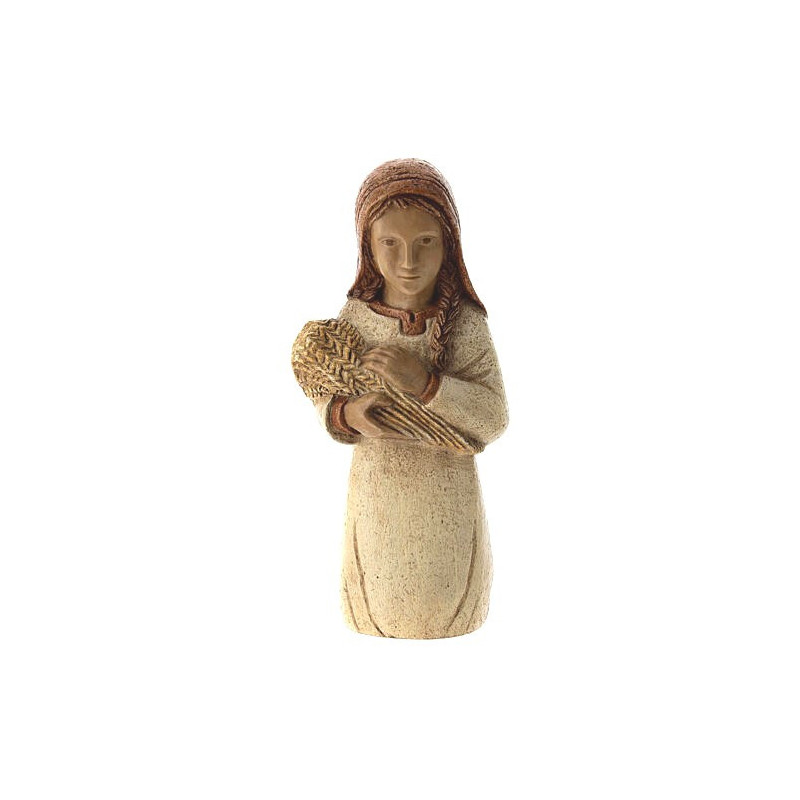 Magnifique statue d'une bergère aux épis" réalisée en pierre naturelle: la dolomie. Cette création artisanale des sœurs de Bethleem mesure 22cm. Elle porte dans ses bras un bouquet de blé, et dans son dos un jeune enfant. Les finitions blanches et beiges, sont faites à la main.
