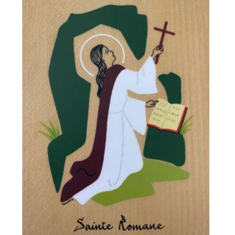 Cadre religieux en bois laminé représentant Sainte Romane.