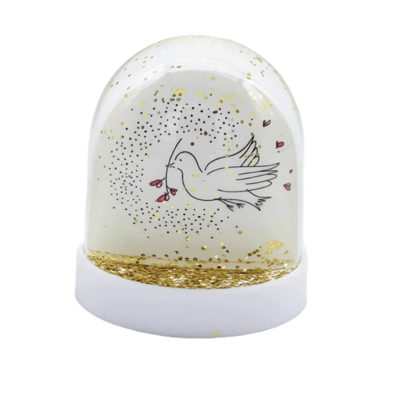 Les paillettes sont dorées étincelantes. Le socle est blanc.
