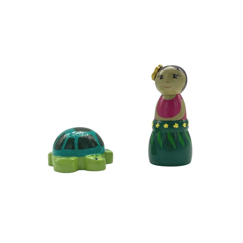 La jolie tahitienne porte une jupe en feuilles de palmier et une fleur dans le s cheveux. Elle est accompagnée par une tortue.
