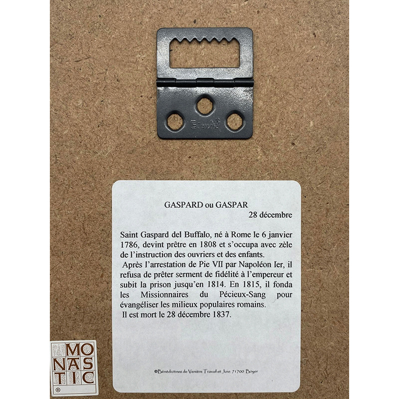 Ce cadre religieux en bois laminé représente Saint Gaspard, une réalisation artisanale des sœurs de l'abbaye de Venières, bénéficiant du label "Monastic". Dimensions compactes de 10,5x13,5 cm, idéal pour une décoration discrète dans votre foyer ou lieu de culte. Fabriqué selon des méthodes traditionnelles avec une finition de qualité pour une durabilité accrue. Ajoutez une touche de spiritualité à votre intérieur avec cette représentation détaillée de Saint Gaspard. Parfait comme cadeau pour les amateurs d'art religieux ou pour ceux qui recherchent des articles de dévotion authentiques.