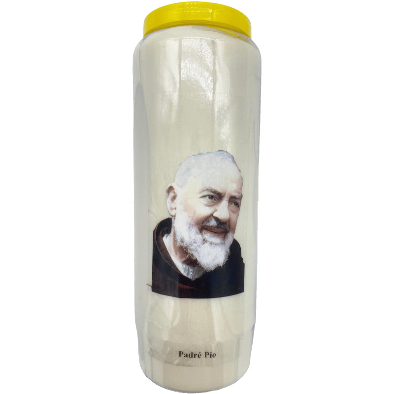 - La bougie de neuvaine Padre Pio est un produit religieux orné de l'image du célèbre saint italien.