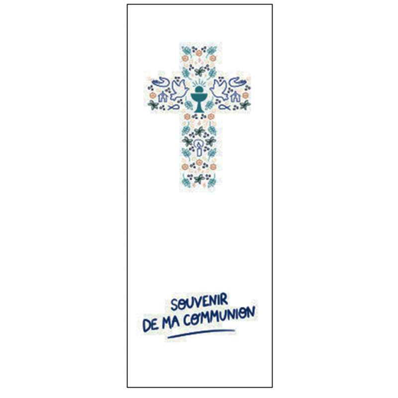 Ce kit de signets représente une croix faite de symboles dont notamment l'eucharistie. Dans les tons bleus.