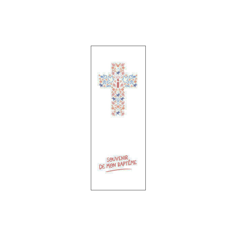 Lot de 12 signets religieux "Souvenir de mon baptême". Ce signet représente une croix dans les tons bleus et roses, ornée de symboles chrétiens : bougie, mains, colombe, ichtus, église... Le tout dans un style floral. Le fond est blanc, avec une écriture rose.