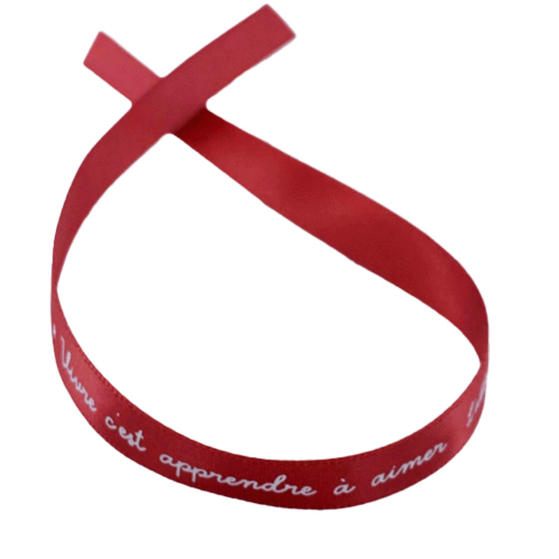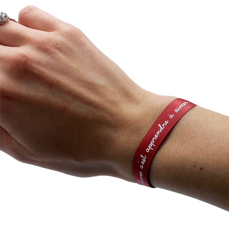 Ruban rouge "Vivre c'est apprendre à aimer" L'Abbé Pierre à nouer autour du poignet, faisant partie d'une gamme de produits solidaires reversant 20% du prix à une association.