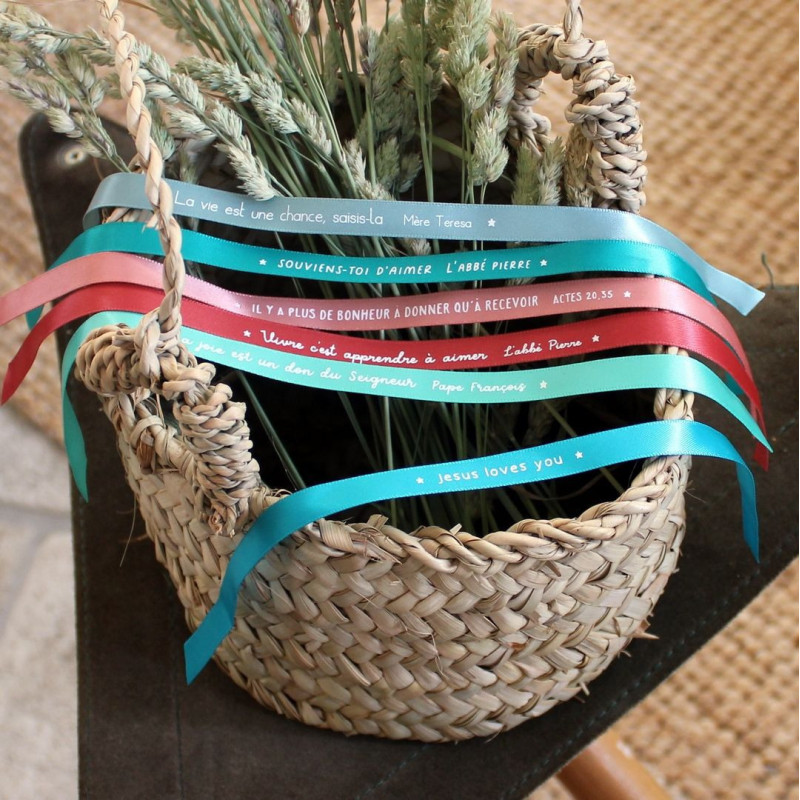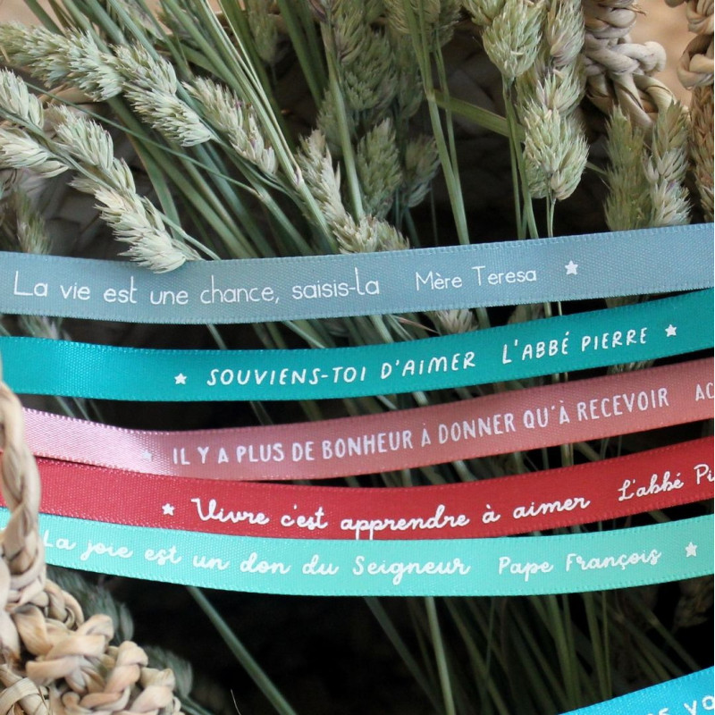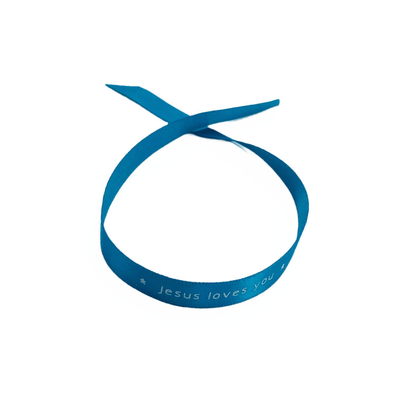 ruban vert canard "Jésus loves you" à nouer autour du poignet, faisant partie d'une gamme de produits solidaires reversant 20% du prix à une association.