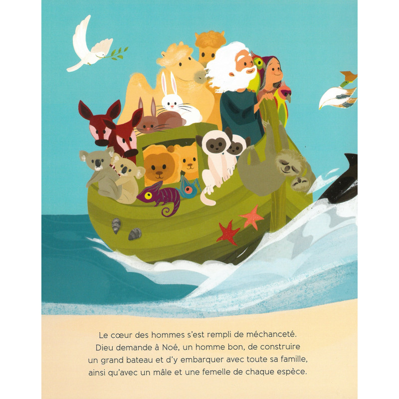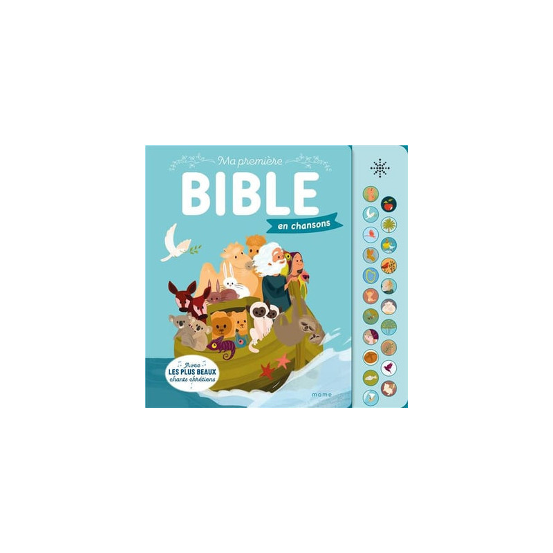 tous les grands épisodes bibliques racontés avec des mots tout simples, de belles images et une sélection des plus beaux chants chrétiens. Avec un bouton on/off pour couper le son quand on emporte le livre à la messe !