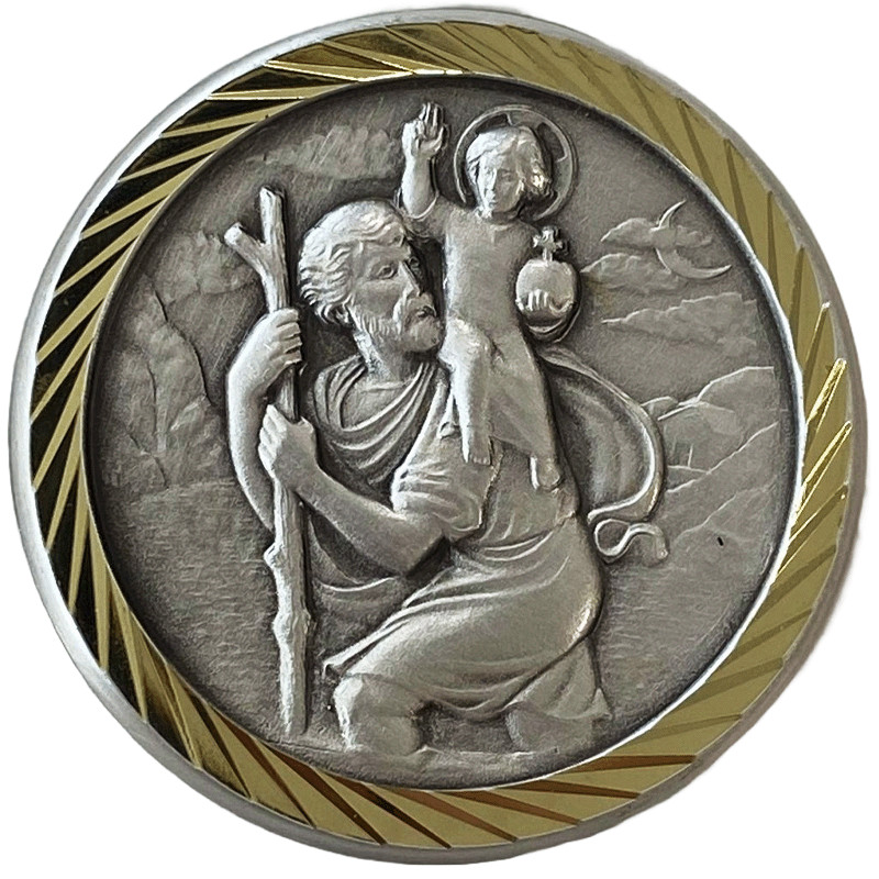 Cette plaque auto représente Saint Christophe. Son diamètre est de 3cm. Cette plaque Saint Christophe est une fabrication française.
