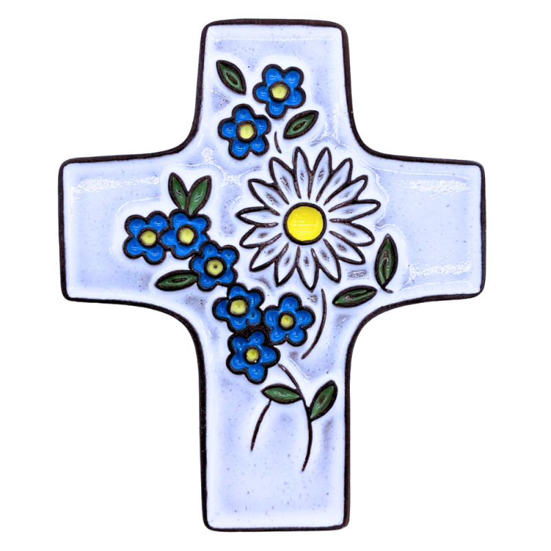Cette croix céramique blanche est décorée de fleurs bleues et d'une marguerite centrale à cœur jaune, symbolisant la pureté et la création. Parfaite comme élément décoratif, elle apporte une atmosphère paisible et une touche de couleur naturelle à n'importe quel espace. Sa confection artisanale assure que chaque pièce est unique, faisant d'elle un cadeau spirituel et personnel pour vos proches ou pour vous-même.