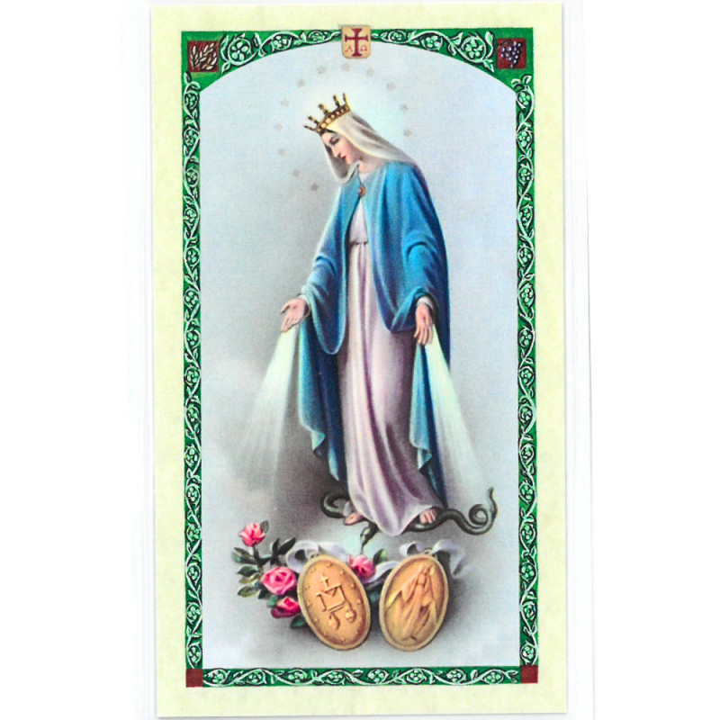 - Image de face : Vierge Miraculeuse, couronnée et vêtue de bleu et rose.