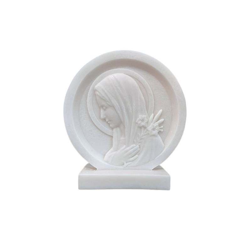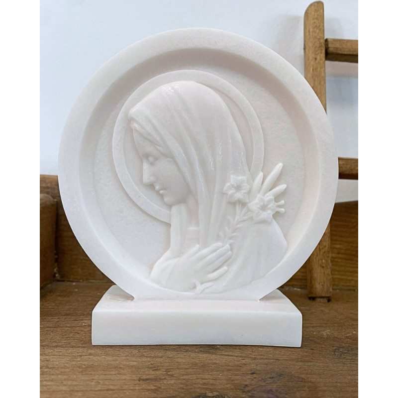 Cette Vierge est de profil et tient dans sa main une fleur de lys.