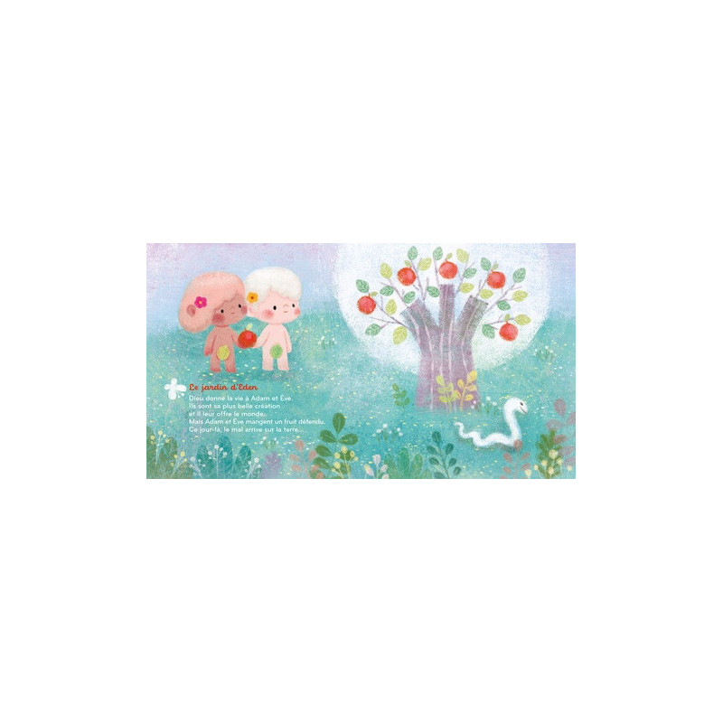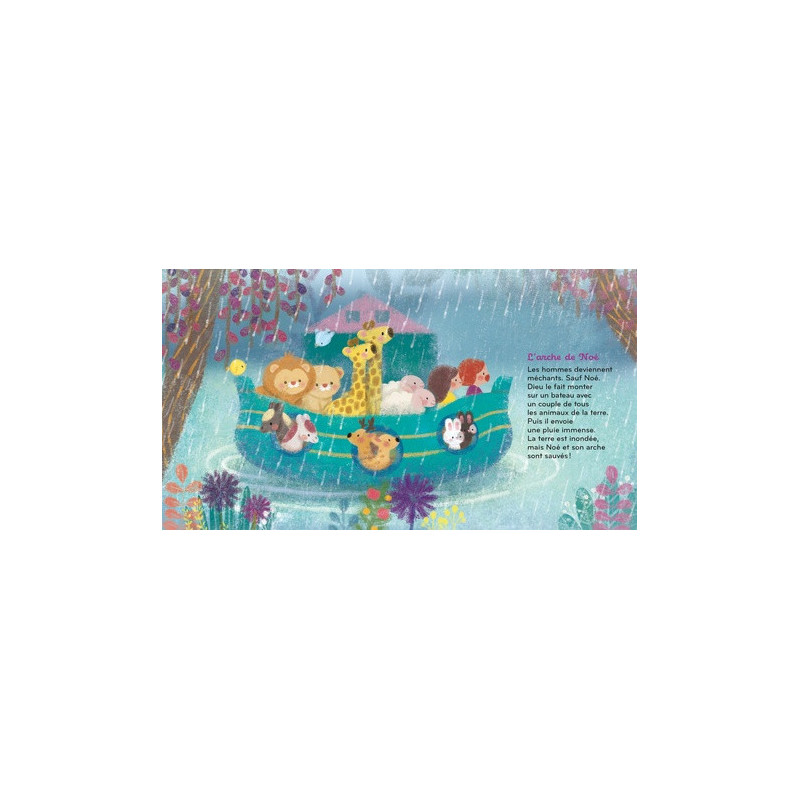 Vous retrouverez des textes courts et de magnifiques illustrations colorées et douces à la fois : la création du monde, le jardin d'Eden, l'arche de Noé, la descendance d'Abraham, Moïse sauvé des eaux, la traversée de la Mer Rouge puis l'Annonciation, la nuit de Noël, le baptême de Jésus, la pêche miraculeuse, Jésus et les enfants, le dernier repas, la résurrection, le jour de ton baptême.