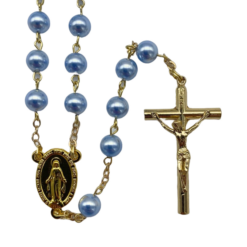 Chapelet en Fil Doré avec Perles Bleu Brillant Swarovski