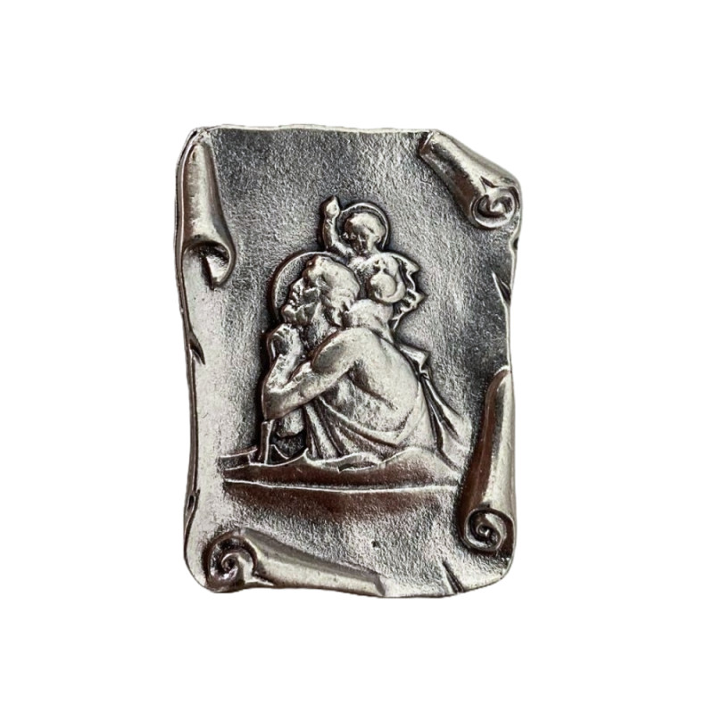 Optez pour une touche de spiritualité et de protection avec cette magnifique plaque auto argentée représentant Saint Christophe. Taillée dans un rectangle aux bords arrondis et ornée de volutes délicates, cette plaque met en scène Saint Christophe dans une pose emblématique, portant l'enfant Jésus. Ce symbole fort de protection est parfait pour accompagner chaque voyageur dans ses déplacements.