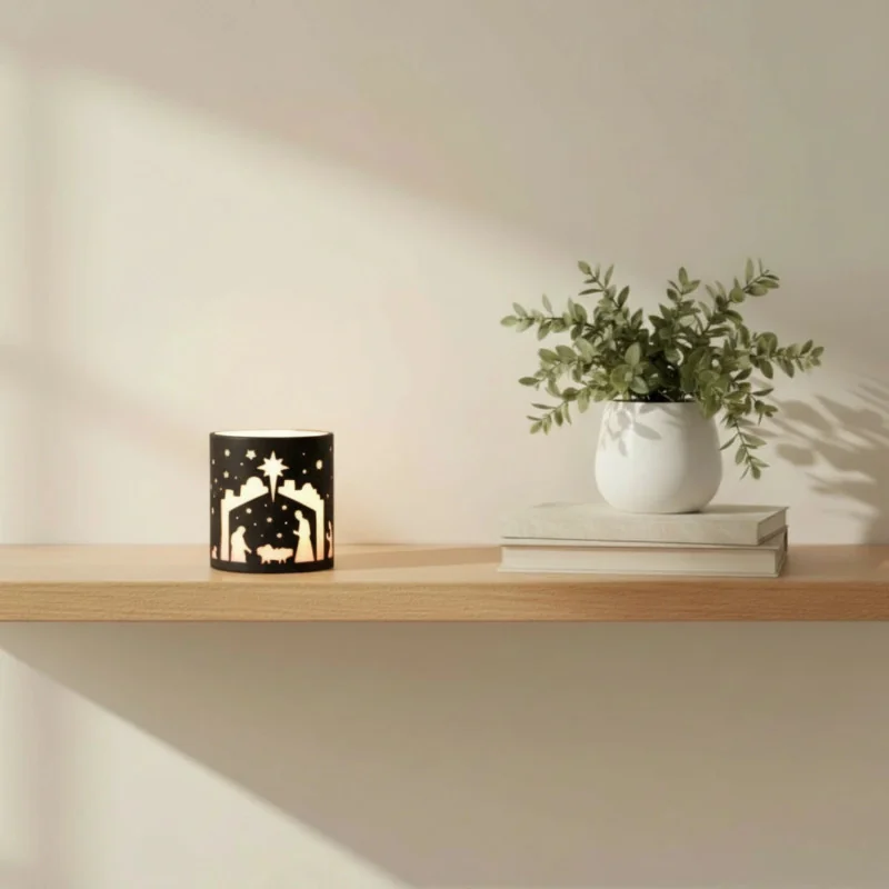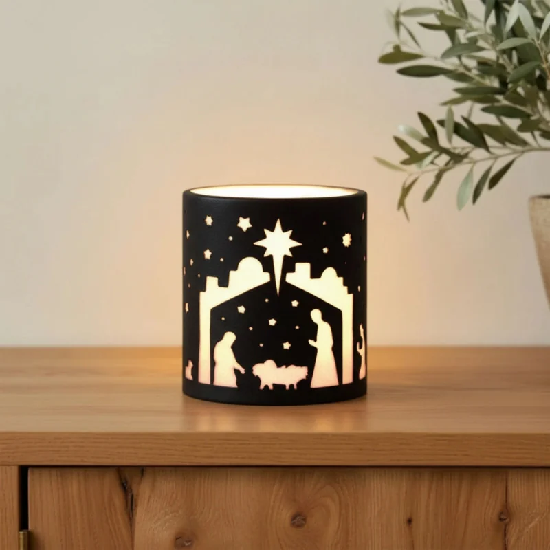 Lorsque la bougie est allumée à l’intérieur, la lumière diffuse à travers les motifs gravés donnant vie à la scène, apportant une ambiance de sérénité et de recueillement, idéale pour célébrer la période de Noël.