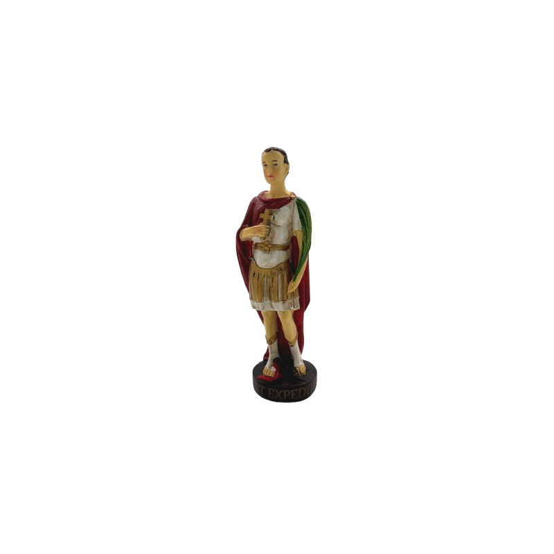 Sa hauteur est de 16 cm. Les finitions de cette statue sont faites à la main à la peinture. La résine présente l'avantage d'être un matériau beaucoup plus solide que le plâtre. L' utilisation de cette statue religieuse de Saint Expédit est recommandée pour l'intérieur.