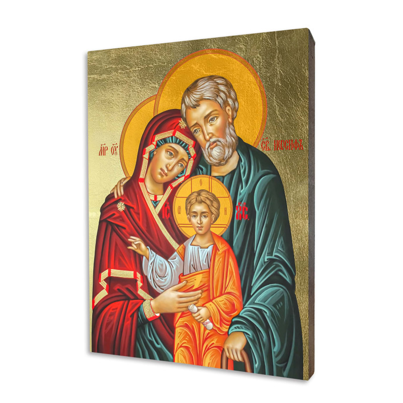 Réalisée en bois (Tilleul), cette icone religieuse représente la Sainte Famille à Nazareth. Cette icone est sur un support en bois massif, doré à la feuille d'or à la main.