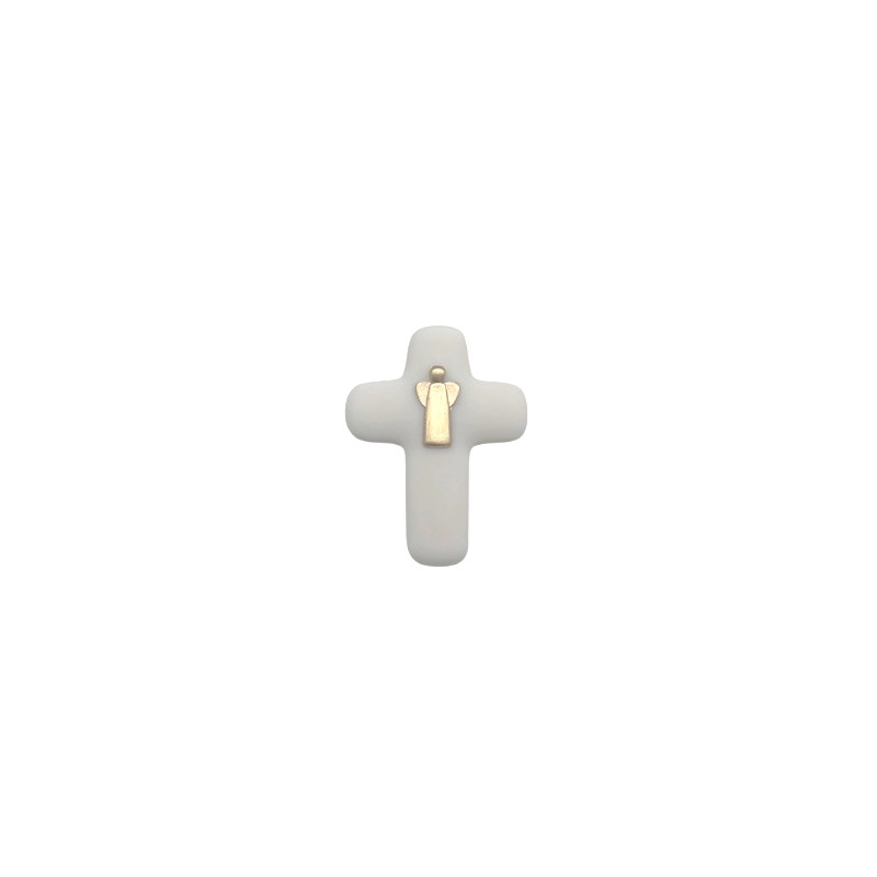 La pierre d'albâtre blanche apporte de l'élégance et de la douceur à la croix, qui devient translucide sous l'effet des rayons de lumière. L'ange est peint à la main dans une peinture dorée lumineuse. La collection EMANY tire son nom du prénom Emmanuel, « Dieu avec nous ». La croix est conçue en France et fabriquée en Europe. Elle est présentée dans une boîte en carton recyclé et sans plastique, avec une impression réalisée avec des encres sans solvants.
