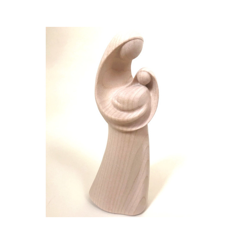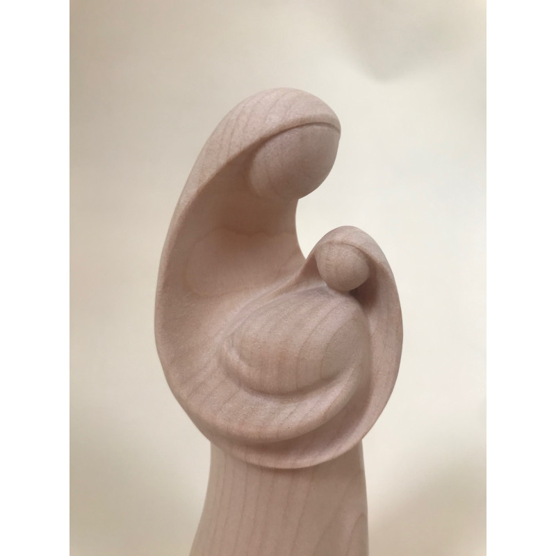 Parfaite pour ajouter une touche de sérénité à tout espace. Cette statue épurée en bois naturel illustre la Vierge Marie tenant tendrement l'Enfant Jésus. Sa conception stylisée avec des courbes douces met en valeur la connexion et l'amour maternel. D'une hauteur de 15 cm, elle est sculptée avec soin dans les Alpes italiennes, offrant à la fois simplicité et élégance pour toute décoration intérieure ou comme symbole spirituel.
