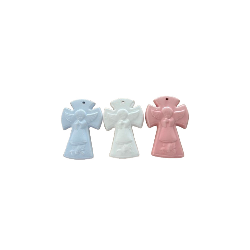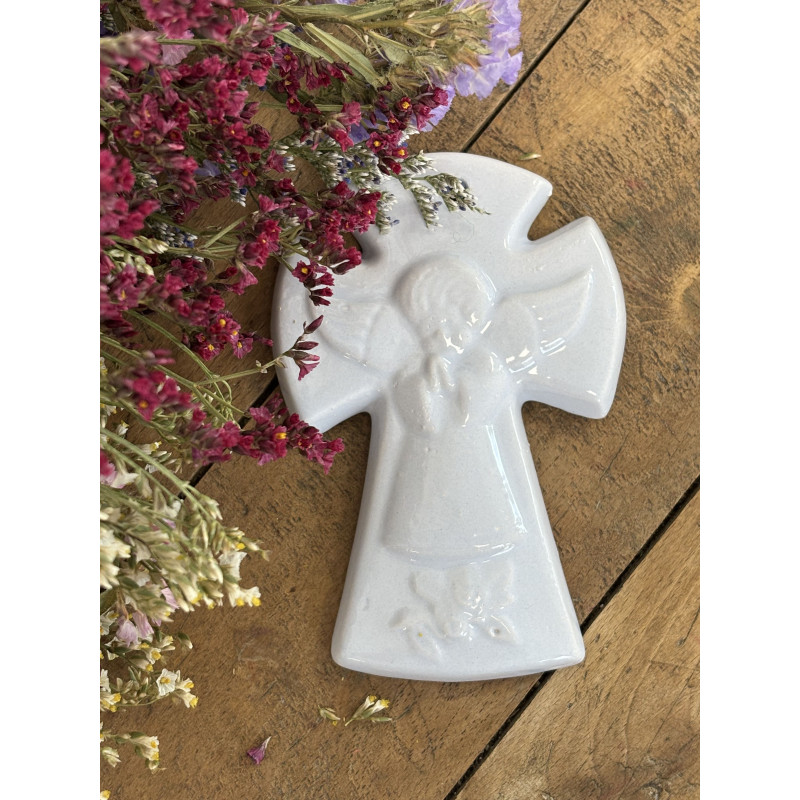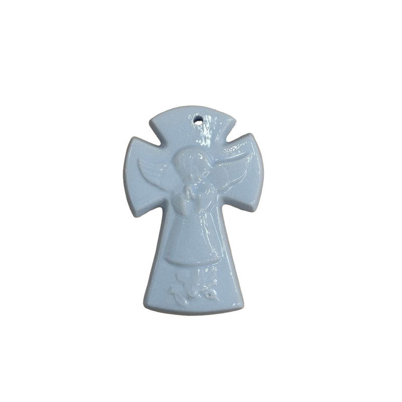 Cette croix en faïence bleu clair est décorée d'un ange en relief, symbolisant la pureté et la sécurité. Parfaite comme élément décoratif, elle apporte une atmosphère paisible et une touche de couleur naturelle à n'importe quel espace. Sa confection artisanale assure que chaque pièce est unique, faisant d'elle un cadeau spirituel et personnel pour vos proches ou pour vous-même.
