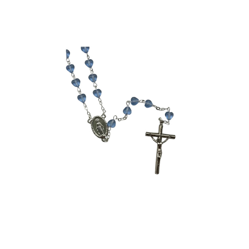 Chaque grain est une perle en verre facetté bleu, délicatement taillée en forme de cœur. Ces perles lumineuses captent la lumière avec éclat, ajoutant une touche de pureté et de tendresse à l’ensemble. Leur forme symbolique évoque l’amour divin et rend ce chapelet particulièrement touchant et personnel.