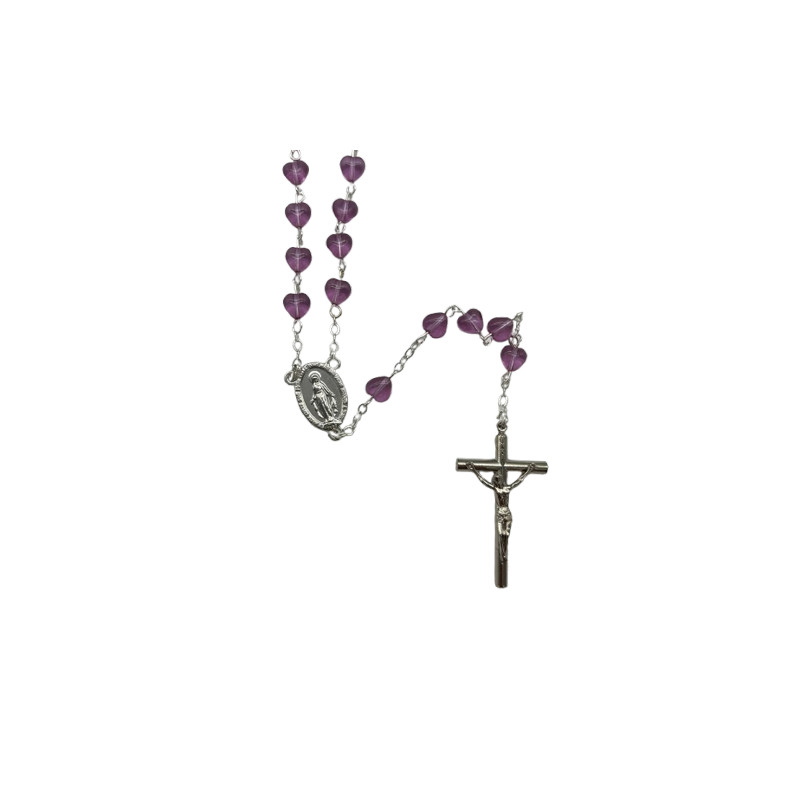 Chaque grain est une perle en verre facetté rose, délicatement taillée en forme de cœur. Ces perles lumineuses captent la lumière avec éclat, ajoutant une touche de pureté et de tendresse à l’ensemble. Leur forme symbolique évoque l’amour divin et rend ce chapelet particulièrement touchant et personnel.