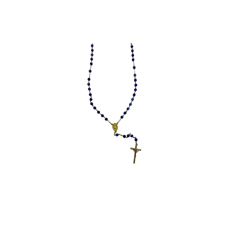 Ce chapelet, monté sur chaîne et fil doré, est orné de perles en verre recyclé bleu, aux reflets apaisants. Il est fabriqué minutieusement à la main en France, dans le respect de la tradition artisanale.