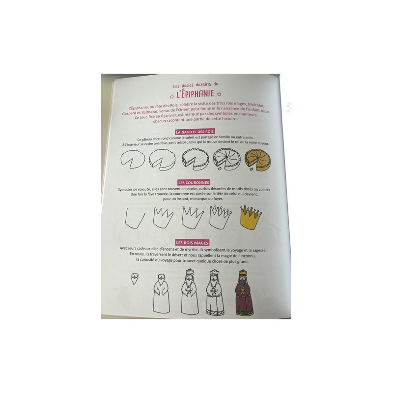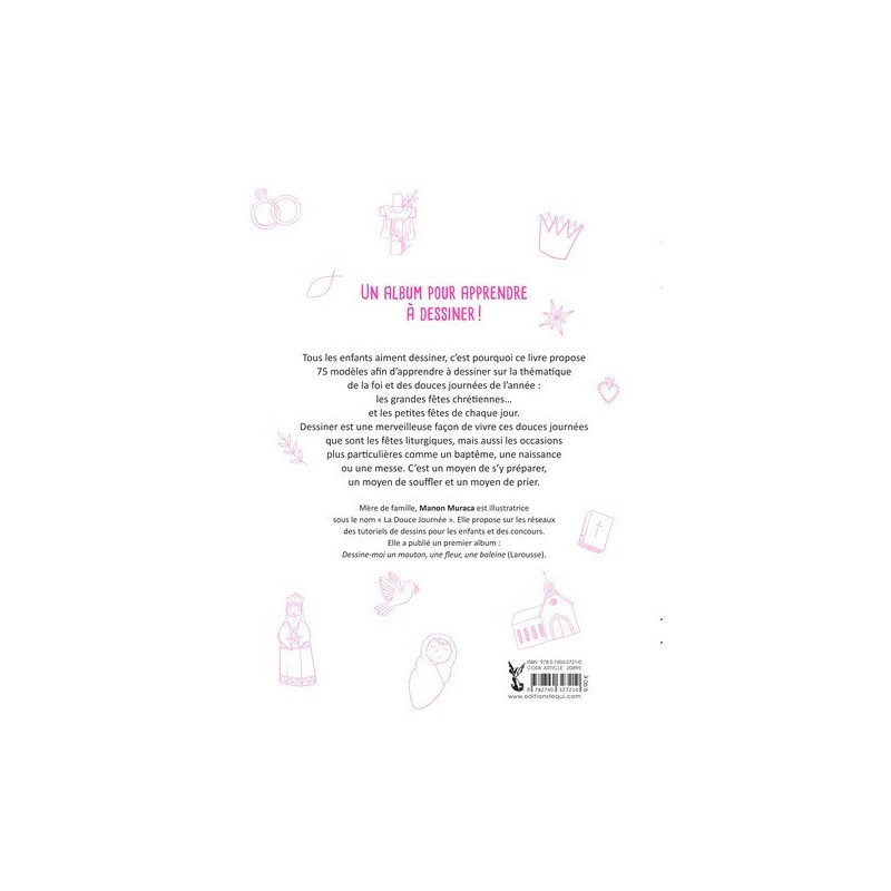 Chaque page offre raconte une fête chrétienne ou une célébration du quotidien - comme les rameaux, l'assomption, le baptême, le mariage — suivie d'une activité de dessin simple et accessible. Grâce à des formes de base (cercles, traits, courbes), les enfants peuvent reproduire les petits éléments illustrés dans le livre tout en développant leur motricité fine et leur imagination.