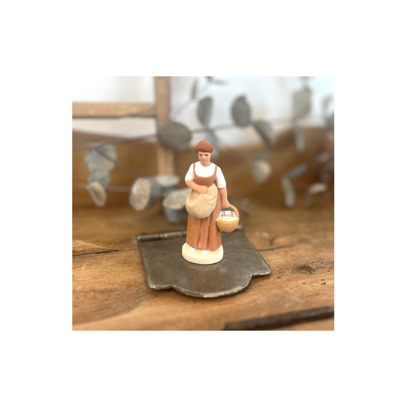 Portant sur ses hanches un tablier rempli et dans une main un panier, la fermière vient compléter la crèche de Noël.