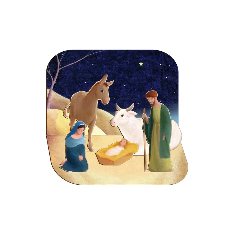 On retrouve toute la sensibilité de Eric Puybaret à travers cette crèche de Noël avec un décor aux tons bleus nuit et des personnages très recueillis.