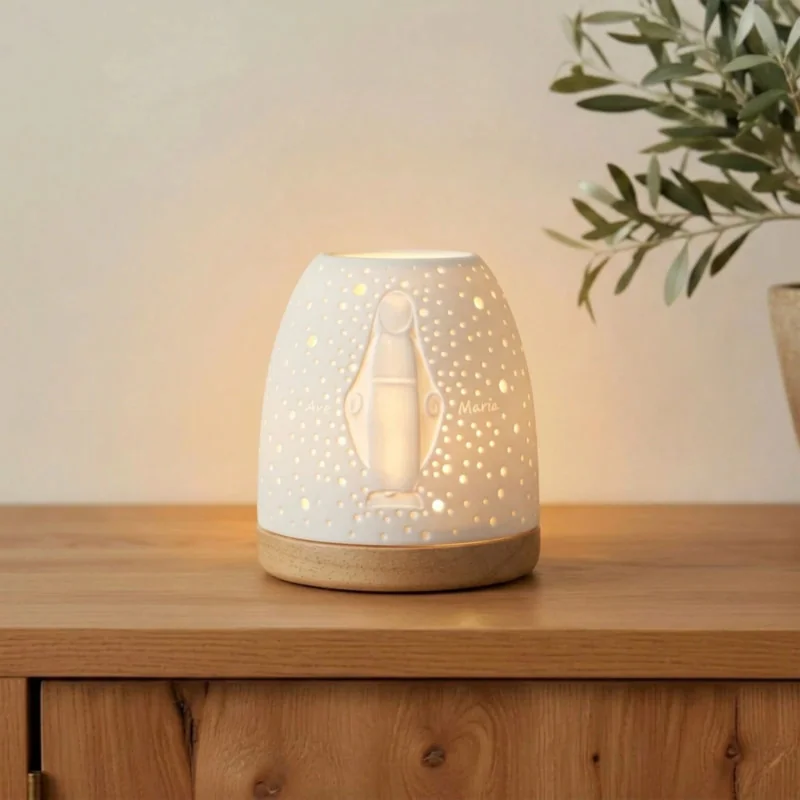 Avec ses dimensions pratiques (D 9 cm x H 9,5 cm), ce photophore trouve sa place dans n'importe quel coin de votre maison, ajoutant une note de spiritualité à votre décoration intérieure. Parfait comme cadeau de remerciement, de bienvenue, de grâces, ce photophore est un choix idéal pour les amateurs de décoration religieuse catholique.