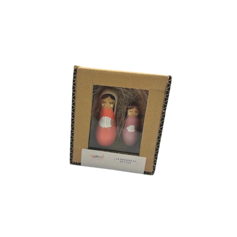 Crèche de Noël issue de la marque Howoki qui se compose d'une bergère portant un mouton et de sa fille portant un agneau. De quoi compléter cette jolie crèche de Noël pour enfant !