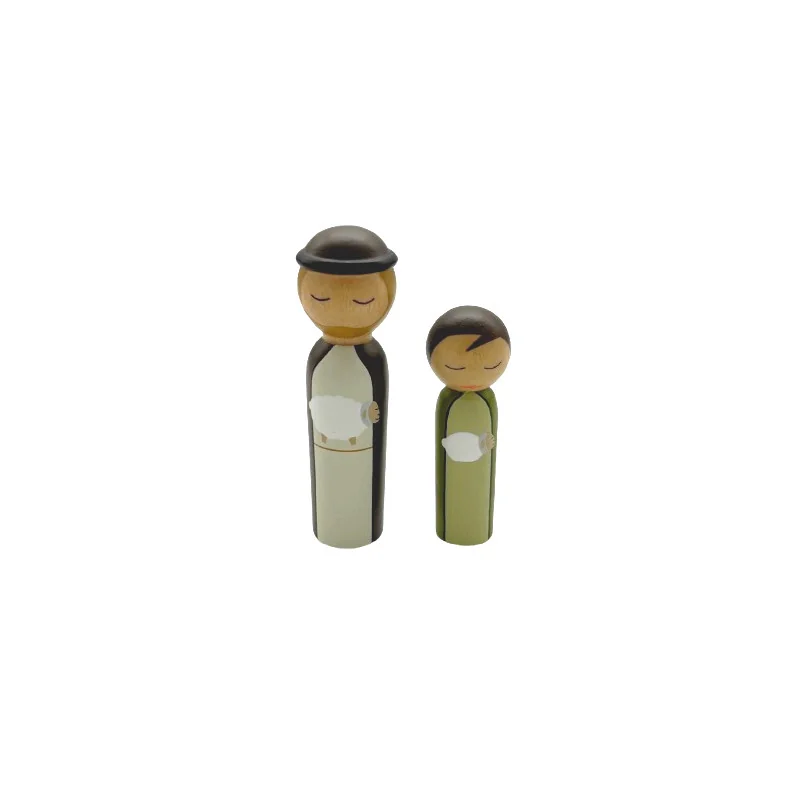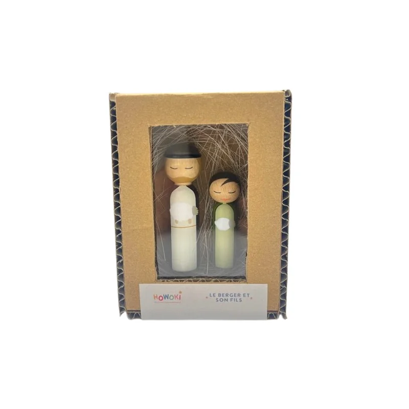Crèche de Noël issue de la marque Howoki qui se compose d'une berger tenant un mouton et de son fils portant un agneau. De quoi compléter cette jolie crèche de Noël pour enfant !
