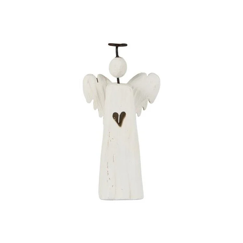 Finement travaillé, cet ange en bois peint en blanc arbore un cœur sculpté et une auréole en fer forgé au-dessus de la tête, pour une décoration naturelle et raffinée.