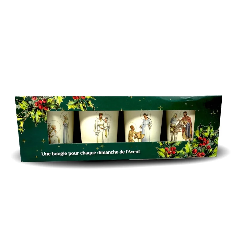 Ces bougies sont fabriquées en France par la Ciergerie Notre Dame de France depuis 1736. 4 illustrations différentes pour symboliser l'Avent : de l'Annonciation à Marie, au départ pour Bethléem, en passant par le mariage de Joseph et Marie et la préparation du berceau. Au recto l'illustration, en verso, le chiffre des 4 semaines de l'Avent avec angelot.