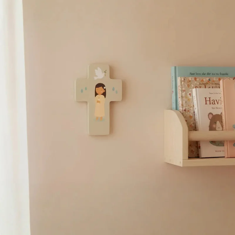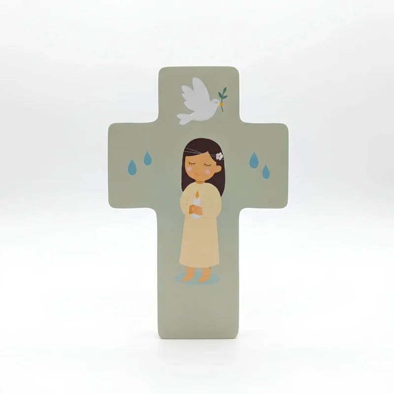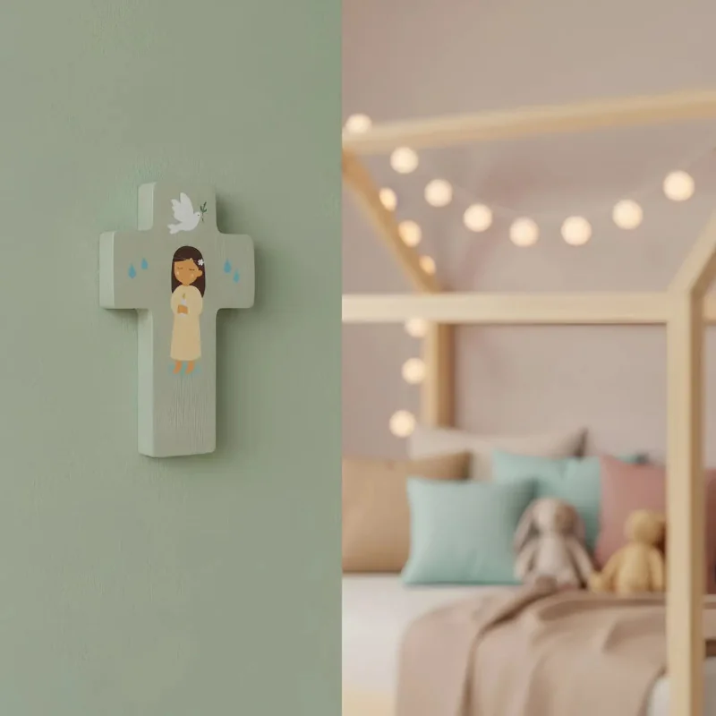 Issue de la collection HOWOKI, cette croix est soigneusement peinte à la main dans des tons doux et apaisants, parfaitement adaptés à l’univers des enfants. Son illustration délicate met en scène une jeune fille recueillie, évoquant les sacrements et les moments importants de la vie chrétienne comme le baptême ou la première communion.