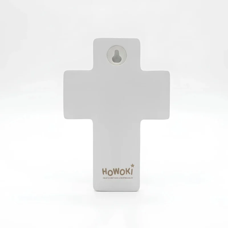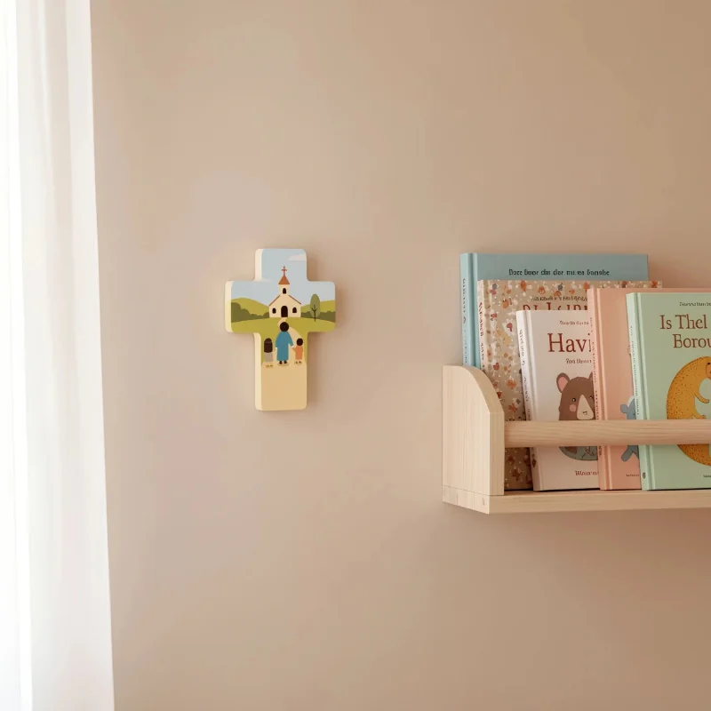 Issue de la collection HOWOKI, cette croix est soigneusement peinte à la main dans des tons doux et apaisants, parfaitement adaptés à l’univers des enfants. Son illustration délicate met en scène une scène de vie autour d’une église, évoquant les moments importants de la vie chrétienne tels que le baptême, le catéchisme ou la première communion.