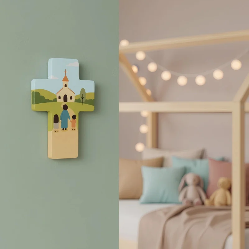 Apportez une touche de douceur et de spiritualité à la chambre de votre enfant avec cette jolie croix en bois illustrée d’une église entourée d’enfants, symbole de foi, de communauté et de cheminement spirituel.