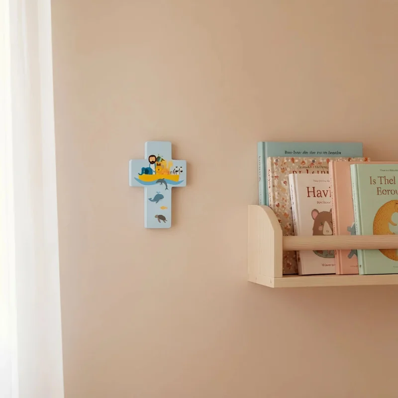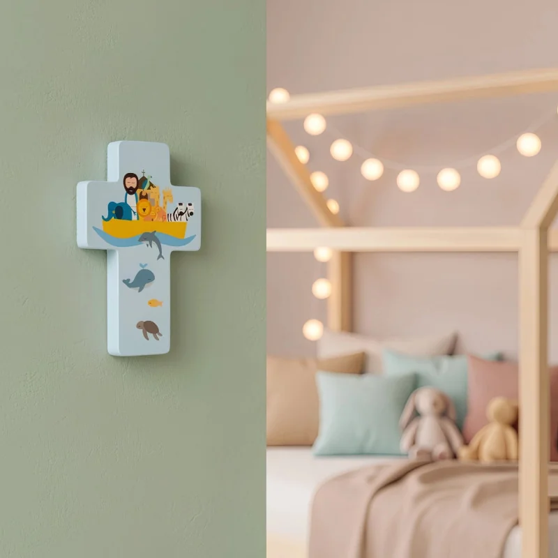 Issue de la collection HOWOKI, cette croix est soigneusement peinte à la main dans des tons doux et colorés, parfaitement adaptés à l’univers des enfants. Son illustration délicate met en scène Noé entouré des animaux dans son arche, évoquant l’un des récits les plus marquants de la Bible et transmettant un message de confiance en Dieu et de respect de la création.