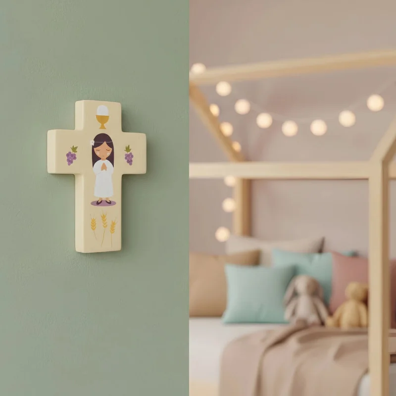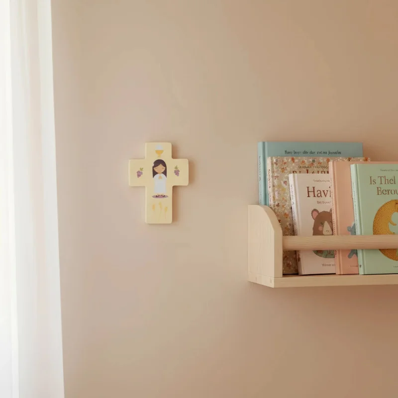 Apportez une touche de douceur et de spiritualité à la chambre de votre enfant avec cette jolie croix en bois illustrée d’une fille en tenue de communion, symbole de foi, de recueillement et de cheminement spirituel.