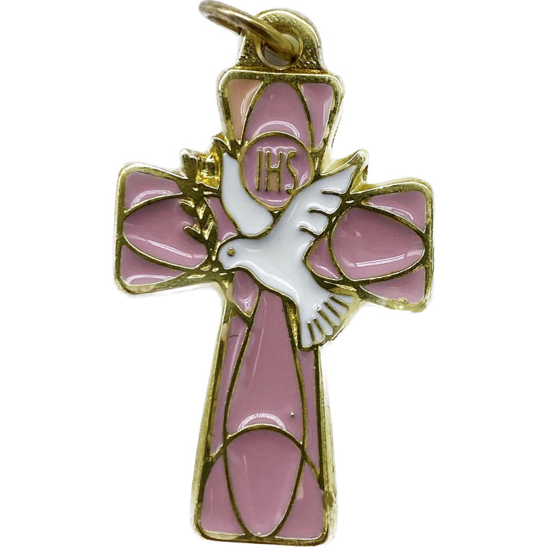 Croix de cou du Saint Esprit "colombe" émaillée rose.