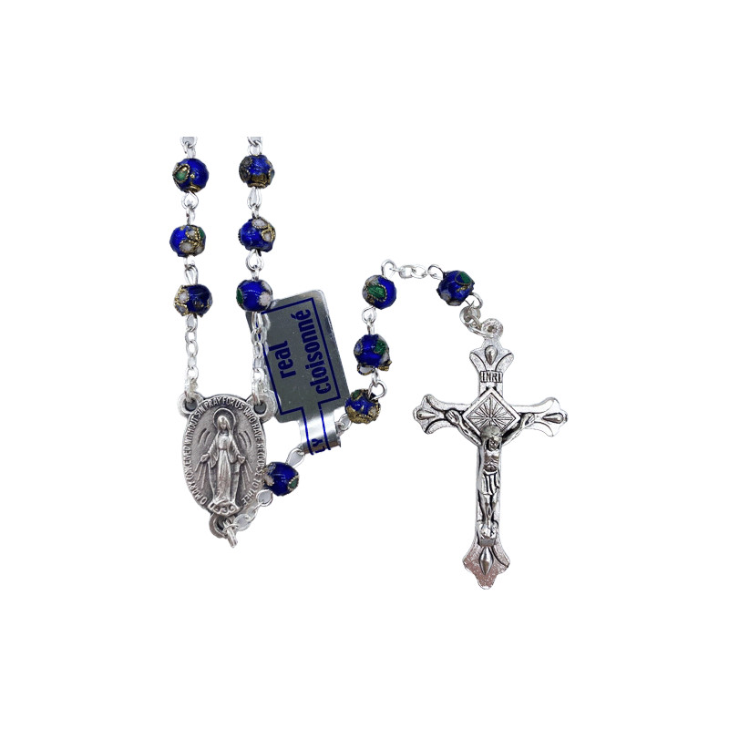 Ce magnifique chapelet est monté sur chaine et fil argenté. Les perles cloisonnées sont de coloris bleu. Le diamètre des perles est de 6mm et sont de forme ronde. Il est livré dans une boite.