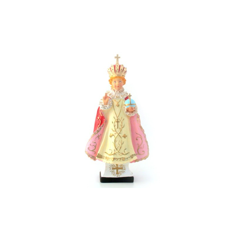 Statue de L'Enfant Jéus de Prague en résine décorée. Sa hauteur est de 16 cm. Les finitions sont faites à la main à la peinture. La résine présente l'avantage d'être un materiau beaucoup plus solide que le plâtre.Son utilisation est recommandée pour l'intérieur.